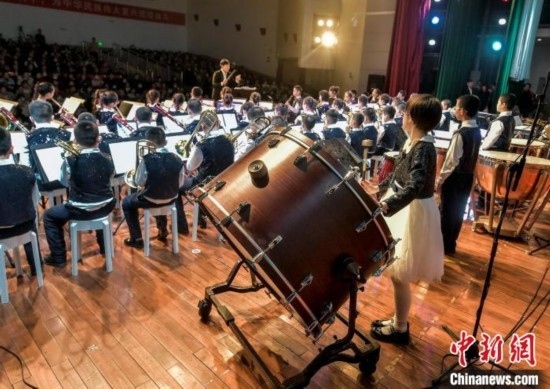烏魯木齊市第27小學(xué)交響管樂團(tuán)登臺獻(xiàn)藝。中新網(wǎng)記者 劉新 攝