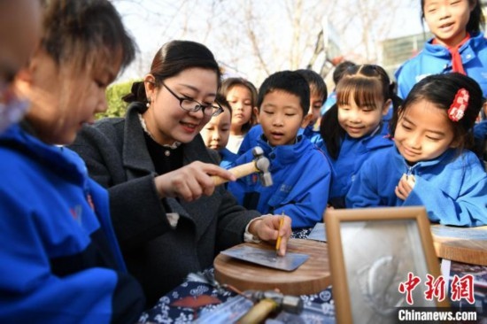 3月11日,河北省級非物質(zhì)文化遺產(chǎn)項目“郭氏鐵板浮雕”傳承人郭墨涵(黑衣)為學生展示技藝。中新網(wǎng)記者 翟羽佳 攝