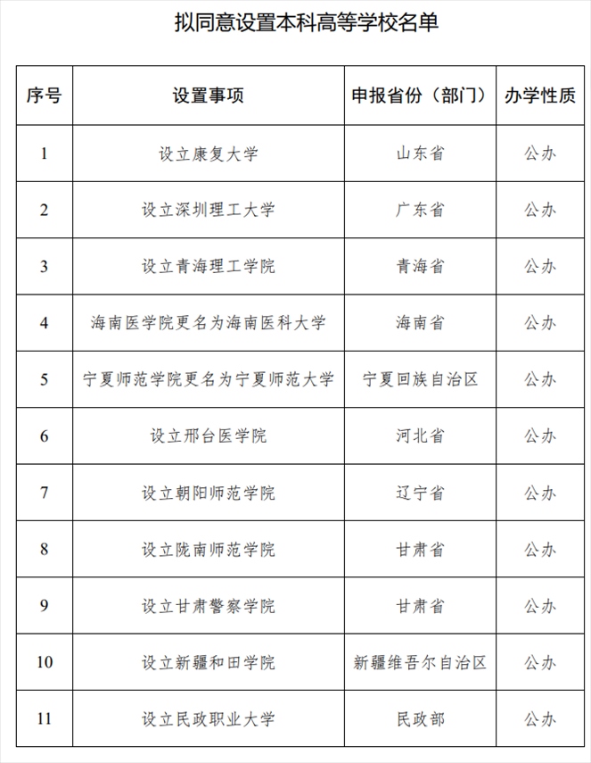 人民網(wǎng)北京5月15日電 (記者李依環(huán))教育部網(wǎng)站今天發(fā)布消息,根據(jù)高等教育法、《普通高等學校設(shè)置暫行條例》等有關(guān)規(guī)定以及第八屆全國高等學校設(shè)置評議委員會考察評議結(jié)果,經(jīng)教育部黨組會議審議,擬同意設(shè)置康復(fù)大學等24所學校。其中,2所高校更名,21所高校為新設(shè)、1所高校為轉(zhuǎn)設(shè)。
