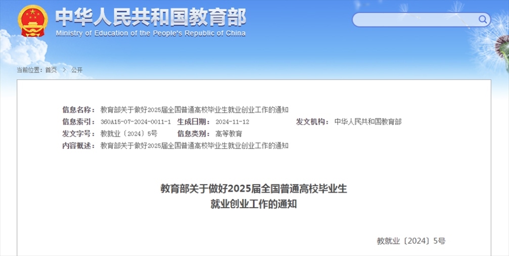 記者11月13日從教育部獲悉,教育部近日印發(fā)通知,部署做好2025屆全國普通高校畢業(yè)生就業(yè)創(chuàng)業(yè)工作。通知提出實施2025屆全國普通高校畢業(yè)生就業(yè)創(chuàng)業(yè)促進和服務體系建設(shè)行動,全力促進高校畢業(yè)生高質(zhì)量充分就業(yè)。