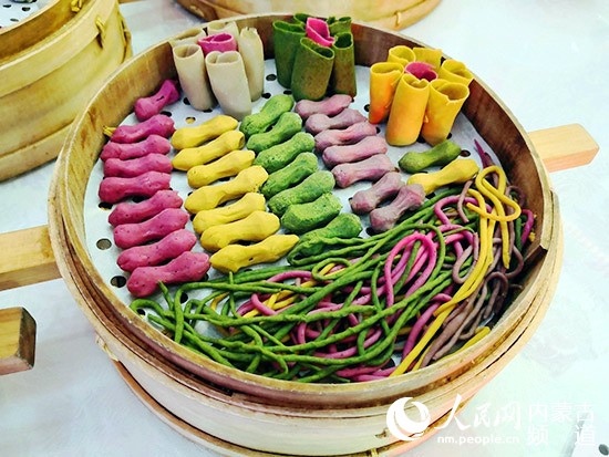 經(jīng)過蒸、烙、炒等多道工序,莜面魚魚、莜面窩窩、莜面卷卷出鍋上籠,散發(fā)著幽幽燕麥清香?!皞鹘y(tǒng)手藝也要創(chuàng)新,”莜面師傅袁俊平把菠菜、火龍果、金瓜、紫薯榨成果蔬汁和在面里?!拔宀瘦妗辈粌H增加了莜面的色澤,食客在品嘗時(shí)也能體驗(yàn)到不同果蔬的滋味。
