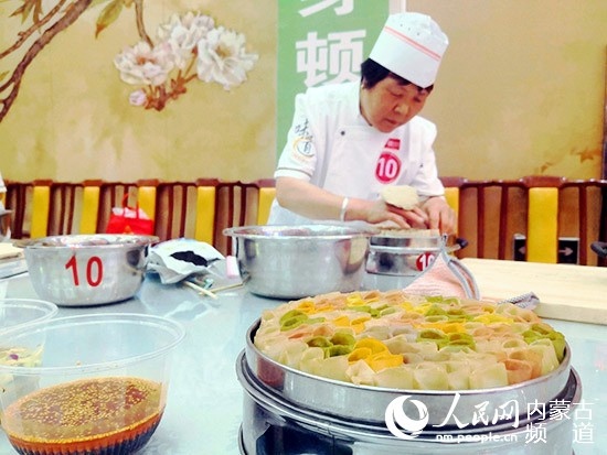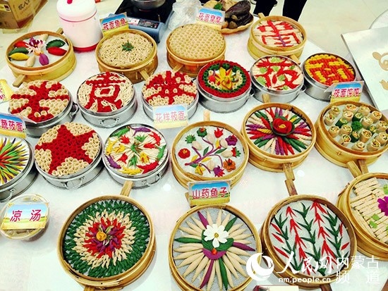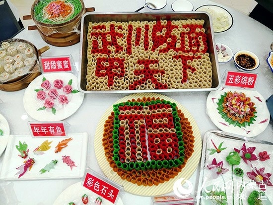 莜面師傅用五彩莜面拼寫“武川莜面甲天下”字樣。陳立庚攝