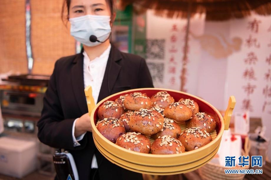 9月22日,在位于山西省忻州市忻府區(qū)小檀村的雜糧美食節(jié)現(xiàn)場,工作人員展示一款雜糧面包。新華社記者 楊晨光 攝