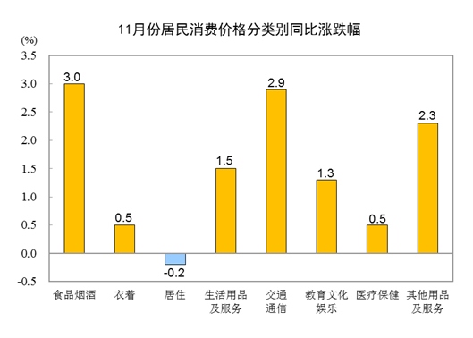 11月份,食品煙酒類價格同比上漲3.0%,影響CPI(居民消費價格指數)上漲約0.85個百分點。食品中,畜肉類價格上漲17.6%,影響CPI上漲約0.56個百分點,其中豬肉價格上漲34.4%,影響CPI上漲約0.47個百分點;蛋類價格上漲9.9%,影響CPI上漲約0.07個百分點;鮮果價格上漲9.6%,影響CPI上漲約0.18個百分點;水產品價格上漲3.4%,影響CPI上漲約0.06個百分點;糧食價格上漲3.0%,影響CPI上漲約0.05個百分點;鮮菜價格下降21.2%,影響CPI下降約0.53個百分點。