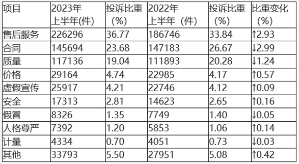 與2022年上半年相比(如表1所示),售后服務(wù)、價格問題投訴比重上升較多,合同、質(zhì)量問題投訴比重下降明顯,其余類投訴變化幅度較小。