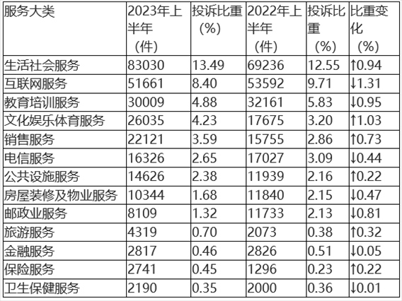 根據(jù)2023年上半年服務(wù)大類投訴數(shù)據(jù)(如圖3、表3所示),生活社會服務(wù)類、互聯(lián)網(wǎng)服務(wù)類、教育培訓(xùn)服務(wù)類、文化娛樂體育服務(wù)類與銷售服務(wù)類居于服務(wù)類投訴量前五位。與2022年上半年相比,文化娛樂體育服務(wù)類、生活社會服務(wù)類投訴比重有所上升,互聯(lián)網(wǎng)服務(wù)類、教育培訓(xùn)服務(wù)類投訴比重略有下降。