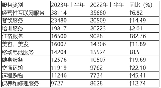 在具體服務(wù)投訴中,投訴量居前五位的分別為(如圖5、表5所示)經(jīng)營性互聯(lián)網(wǎng)服務(wù)、餐飲服務(wù)、培訓(xùn)服務(wù)、住宿服務(wù)、美容美發(fā)。與2022年上半年相比,住宿服務(wù)、遠(yuǎn)程購物、保養(yǎng)和修理服務(wù)進(jìn)入服務(wù)類投訴前十。其中,住宿服務(wù)、遠(yuǎn)程購物投訴量同比顯著增長,移動電話服務(wù)投訴量同比有所下降。