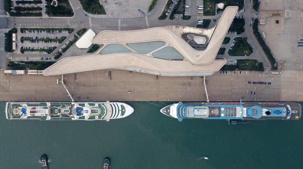 9月27日,“夢想”號郵輪(左)、“地中?!碧栢]輪靠泊在天津國際郵輪母港準(zhǔn)備啟航(無人機(jī)照片)。新華社記者 趙子碩 攝
