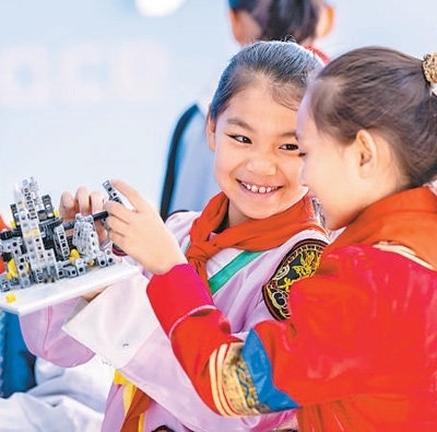 內(nèi)蒙古呼和浩特市,小學(xué)生在校學(xué)習(xí)組裝機(jī)器人。丁根厚攝(影像中國(guó))