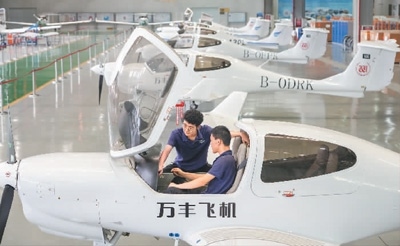 萬(wàn)豐集團(tuán)技術(shù)人員在調(diào)試新下線(xiàn)的飛機(jī)。章永濤攝