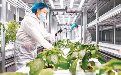 在呼和浩特市的內(nèi)蒙古宇生樂谷豐現(xiàn)代農(nóng)業(yè)產(chǎn)業(yè)園久和數(shù)智植物工廠,工人正進行果蔬生產(chǎn)管理。