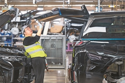 在位于湖北武漢經(jīng)開區(qū)的嵐圖汽車數(shù)字化總裝車間,工人在流水線上作業(yè)。