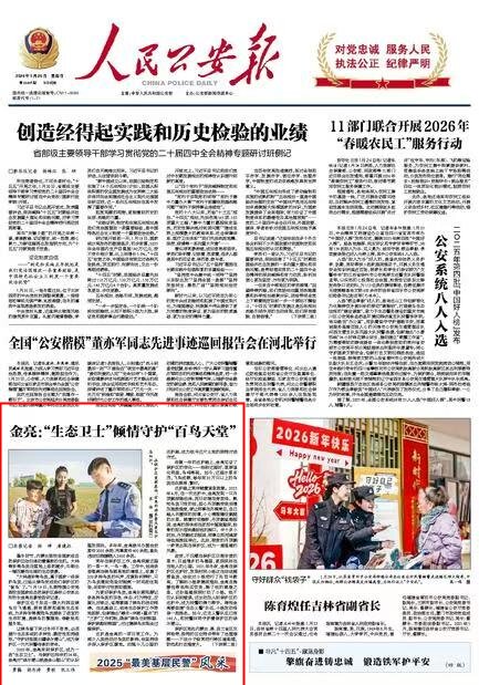 2026年1月25日《人民公安報(bào)》頭版刊發(fā)了《金亮:“生態(tài)衛(wèi)士”傾情守護(hù)“百鳥天堂”》的文章,報(bào)道了內(nèi)蒙古扎賚特旗公安局圖牧吉國家級(jí)自然保護(hù)區(qū)森林公安派出所所長金亮的故事。作為一名當(dāng)?shù)氐摹吧鷳B(tài)衛(wèi)士”,金亮與保護(hù)區(qū)相伴的24年,參與辦理治安案件2000余起、刑事案件400余起,查處違法犯罪嫌疑人2600余名。金亮用實(shí)際行動(dòng)踐行著“守護(hù)好祖國北疆綠水青山”的偉大使命。