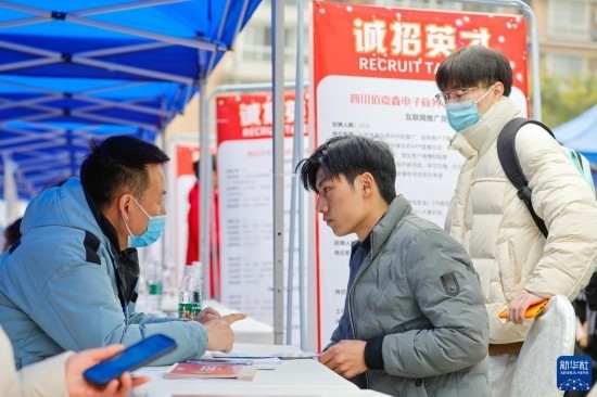 2月17日,在中國(guó)成都人力資源服務(wù)產(chǎn)業(yè)園,求職者(前右)與招聘企業(yè)工作人員交流。