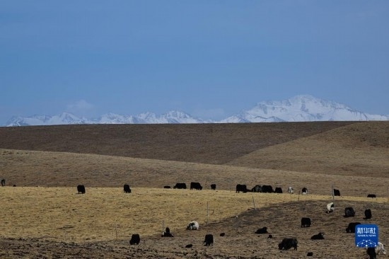 4月17日,在青海省海北藏族自治州門(mén)源回族自治縣皇城蒙古族鄉(xiāng),一群牦牛在祁連山腹地的草場(chǎng)上活動(dòng)。