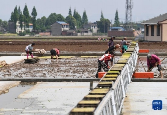 4月20日,在彭山區(qū)公義鎮(zhèn)的數(shù)智水稻示范基地,工人在秧盤(pán)智能傳輸帶上轉(zhuǎn)運(yùn)育秧盤(pán)。