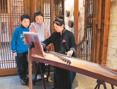 4月9日,在安徽省黟縣石亭村的民宿“拾庭畫(huà)驛”內(nèi),民宿管家在為小朋友演奏傳統(tǒng)樂(lè)器。新華社記者 馬 寧攝
