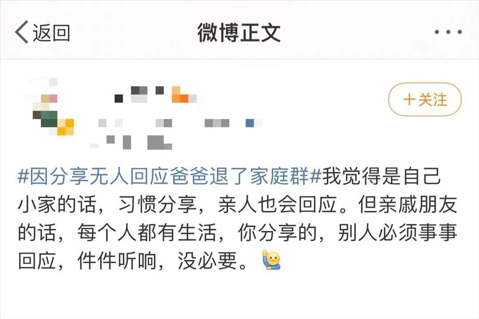 日前,一則“因分享無(wú)人回應(yīng)爸爸退了家庭群”的話題引發(fā)公眾關(guān)注,登上熱搜。