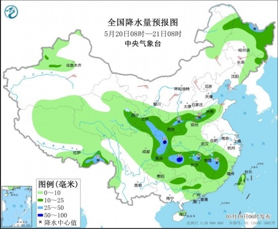5月19日08時(shí)至20日08時(shí),內(nèi)蒙古東部、東北地區(qū)、華北中東部、新疆北部、西藏、西南地區(qū)東部和北部、江南西部和南部、華南大部等地部分地區(qū)有小到中雨,局地有大雨或暴雨(50~70毫米),上述部分地區(qū)伴有短時(shí)強(qiáng)降水,局地有雷暴大風(fēng)或冰雹等強(qiáng)對(duì)流天氣。內(nèi)蒙古、東北地區(qū)、西北地區(qū)東部等地部分地區(qū)有4~6級(jí)風(fēng)。
