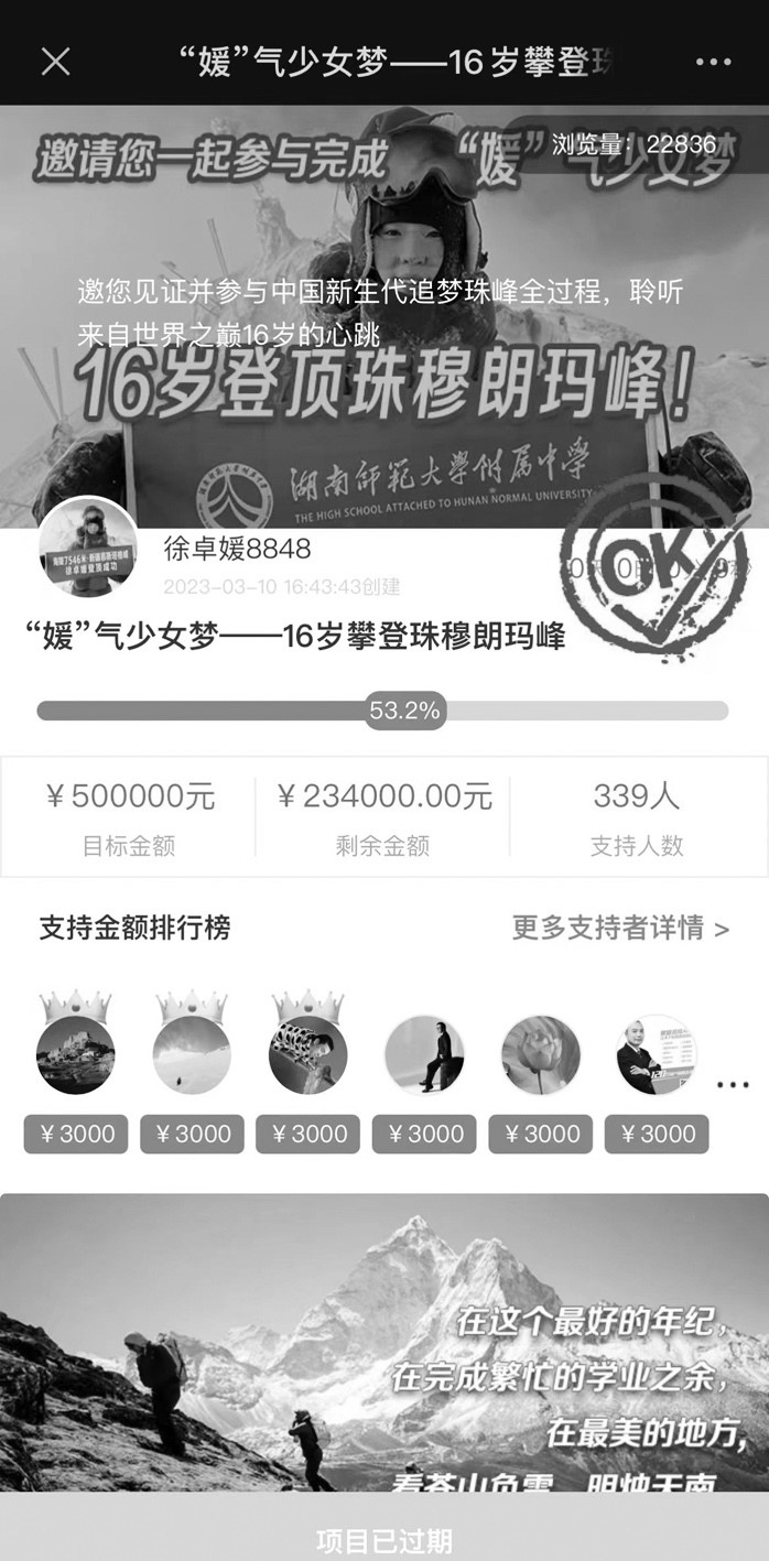 5月15日,揚(yáng)子晚報(bào)紫牛新聞?dòng)浾咴俅吸c(diǎn)開徐卓媛當(dāng)初發(fā)起助力登峰的眾籌鏈接,發(fā)現(xiàn)該項(xiàng)目已過期,籌款進(jìn)度最終定格在53.2%,最終籌集到資金266000元。除去徐江雷朋友們贊助的這二十多萬元,據(jù)了解,還有一些企業(yè)也出資贊助了徐卓媛登頂珠峰的活動(dòng)。徐江雷此前告訴記者,江蘇一家藥企看到此前揚(yáng)子晚報(bào)對(duì)于徐卓媛的報(bào)道后(本報(bào)今年3月17日刊登《眾籌50萬,助16歲女兒挑戰(zhàn)珠峰》一文),被她小小年紀(jì)敢于攀登高峰的精神所打動(dòng),秉承著“少年強(qiáng)則國(guó)強(qiáng)”的理念,慷慨贊助徐卓媛登山資金30萬元。
