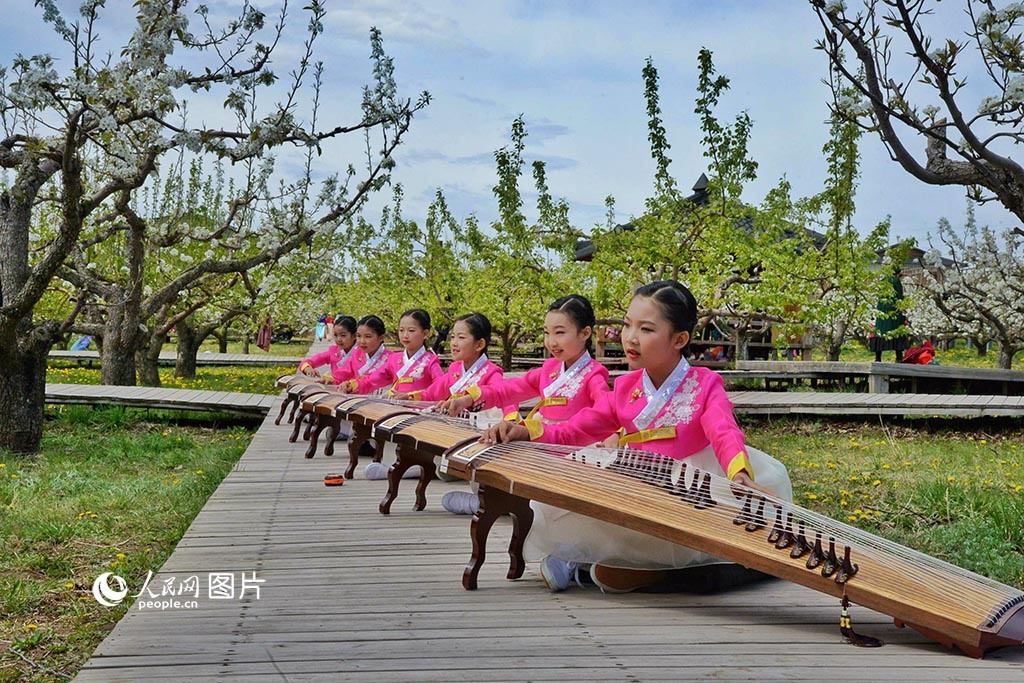 5月11日,吉林省延邊州龍井市萬畝梨園迎來梨花盛開期。走在梨樹下,游客們載歌載舞,彈琴賞花,拍照留念。人民網 李洋攝