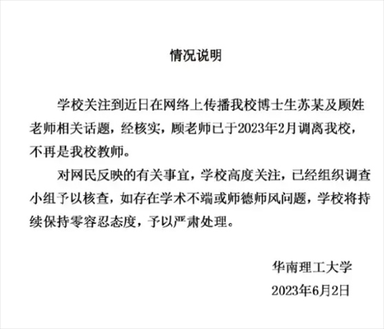 網傳女博士介入導師婚姻,導師帶其發(fā)高水平論文,華南理工大學、四川大學啟動調查工作。