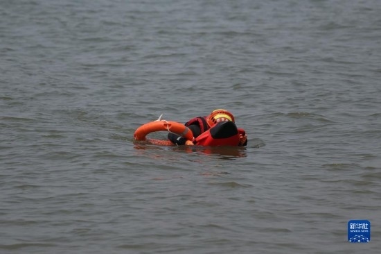 6月2日,在水域救援實(shí)戰(zhàn)演習(xí)現(xiàn)場(chǎng),一名模擬被困人員依靠智能水上救生遙控機(jī)器人回到岸邊。