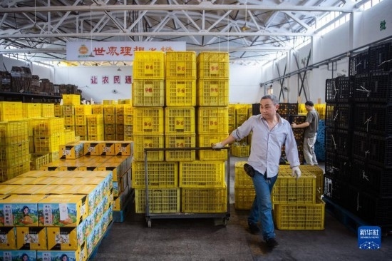 6月8日,在秭歸縣華維電商物流園區(qū)內(nèi),工作人員運(yùn)輸即將發(fā)貨的臍橙。