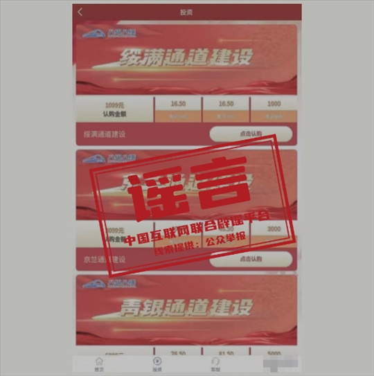真相:近期,中國國家鐵路集團有限公司接到群眾來電咨詢,反映一款名為“八縱八橫”APP程序自稱是國鐵集團授權(quán)推出的理財產(chǎn)品,設(shè)有“呼南通道建設(shè)”“沿海通道建設(shè)”“京蘭通道建設(shè)”等9款投資理財項目,并將國鐵集團公司簡介、新聞報道等內(nèi)容在APP中用于宣傳推廣。對此,國鐵集團發(fā)布嚴(yán)正聲明稱,國鐵集團及所屬單位從未授權(quán)或利用其他網(wǎng)站、APP、微信公眾號、微博等形式以“國鐵集團”或“中國鐵路”的名義銷售投資理財產(chǎn)品,也沒有通過這樣的方式籌集鐵路建設(shè)資金。不法分子利用“八縱八橫”APP程序所實施的行為和發(fā)布的內(nèi)容已涉嫌詐騙,請公眾提高警惕,謹(jǐn)慎區(qū)分,注意防騙。如已被騙,請立即向公安機關(guān)報案。(來源:“中國鐵路”微信公眾號)