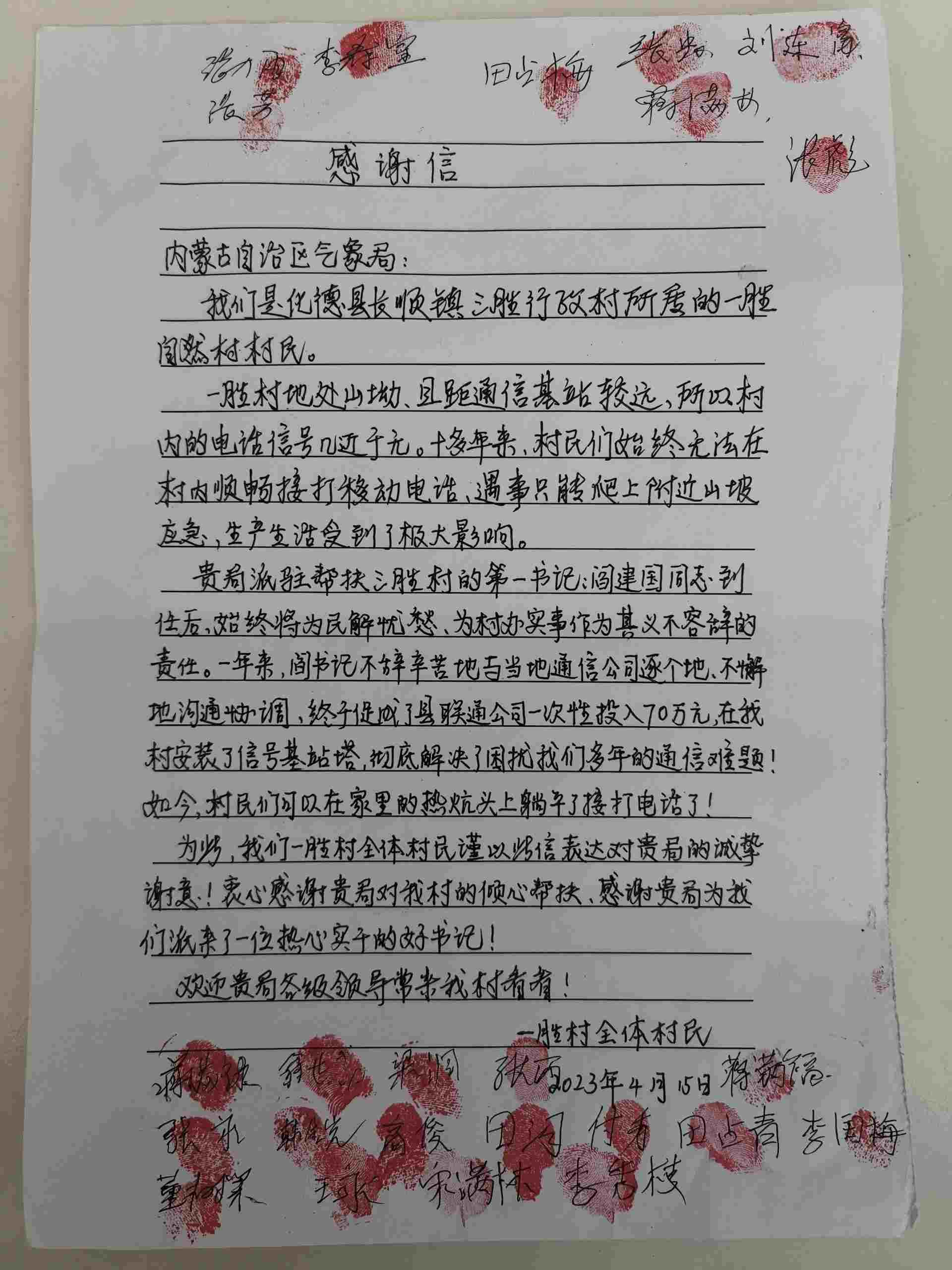 近日,一封署名為“一勝村全體村民”的感謝信,被專程送至內蒙古氣象局,信紙上的空白處簽滿了24個名字,還有一枚枚鮮紅的指印,這封信承載著烏蘭察布市化德縣一勝村16戶村民對駐村第一書記閻建國的誠摯謝意。