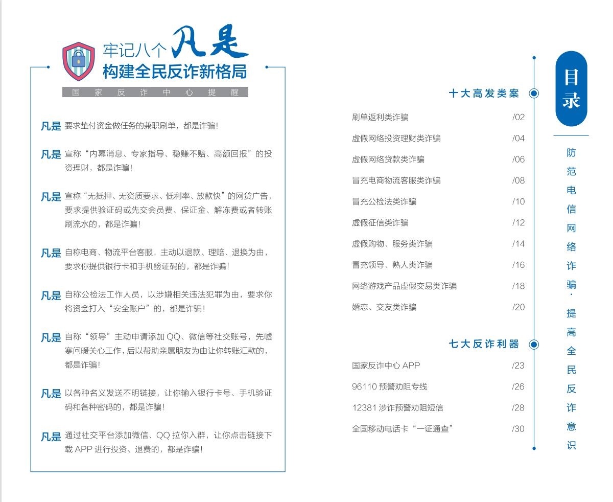 聚焦“關(guān)口前移、預(yù)防為先”,《手冊(cè)》詳細(xì)介紹了過去兩年里,公安部會(huì)同工信部、中國人民銀行聯(lián)合推出的七大反詐利器——國家反詐中心APP、96110預(yù)警勸阻專線、12381涉詐預(yù)警勸阻短信系統(tǒng)、全國移動(dòng)電話卡“一證通查”、云閃付APP“一鍵查卡”、反詐名片、全國互聯(lián)網(wǎng)賬號(hào)“一證通查2.0”的主要功能和下載查詢方法,鼓勵(lì)廣大群眾多下載多使用,共同構(gòu)筑攔截電信網(wǎng)絡(luò)詐騙的“防火墻”。