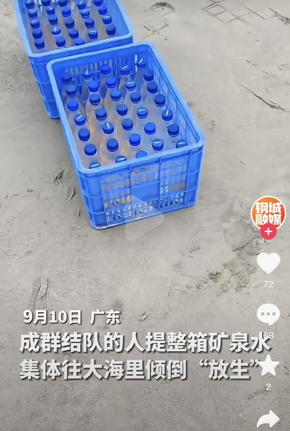 近日,有網(wǎng)友在社交平臺發(fā)布稱,廣東汕尾湖東港有一群人往海里“放生”礦泉水,60多箱礦泉水被浪費?,F(xiàn)場視頻顯示,一群人抬著藍色的箱子正往海邊走,箱子里可見擺放整齊的礦泉水瓶。視頻發(fā)布者介紹,9月10日下午3點多來了兩輛大巴,大巴上坐滿了人。