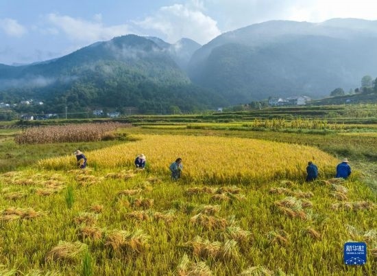 9月14日,重慶市酉陽土家族苗族自治縣楠木鄉(xiāng)紅莊村村民在高山稻田里收割水稻。