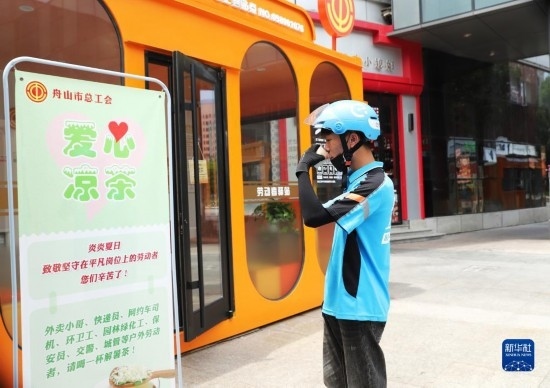 7月7日,外賣配送員在浙江舟山市一處“勞動(dòng)者驛站”飲用“愛(ài)心涼茶”。