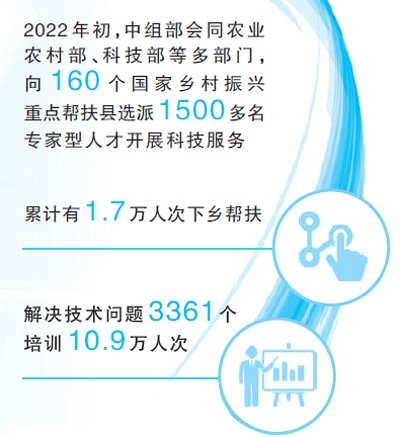 2022年初,中組部會(huì)同農(nóng)業(yè)農(nóng)村部、科技部等多部門,以“一縣一團(tuán)”方式,向160個(gè)國(guó)家鄉(xiāng)村振興重點(diǎn)幫扶縣選派1500多名專家型科技支撐人才,精準(zhǔn)開展科技服務(wù)和人才培養(yǎng)幫帶。
