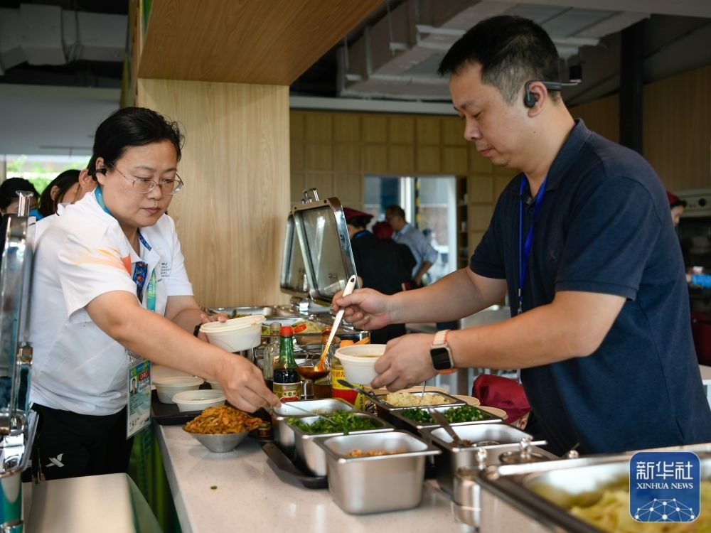 ↑7月14日,工作人員在成都大運(yùn)會(huì)主媒體中心媒體餐廳內(nèi)就餐。新華社記者 胥冰潔 攝