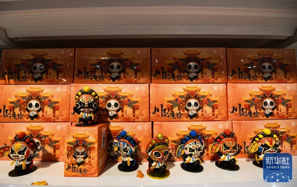 ↑這是7月13日拍攝的成都大運(yùn)會(huì)主媒體中心大運(yùn)會(huì)官方特許商品零售店展出的“蓉寶”川劇變臉造型玩偶。新華社記者 王曦 攝
