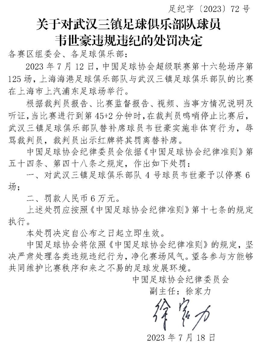 ·18日,中國足球協(xié)會紀(jì)律委員會發(fā)布重磅罰單,球員韋世豪辱罵裁判,被停賽6場罰款6萬。
