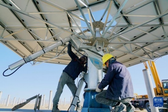 7月21日,在阿克塞千萬千瓦級可再生能源多能互補(bǔ)基地,工人在匯東新能源75萬千瓦光熱+項目建設(shè)現(xiàn)場安裝定日鏡。新華社發(fā)(馬曉偉 攝)