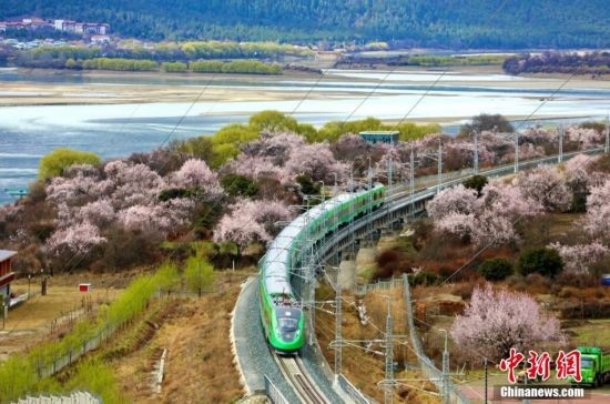 資料圖:桃花、嫩柳與國槐綠涂裝的高原復(fù)興號(hào)。 馬生明 攝