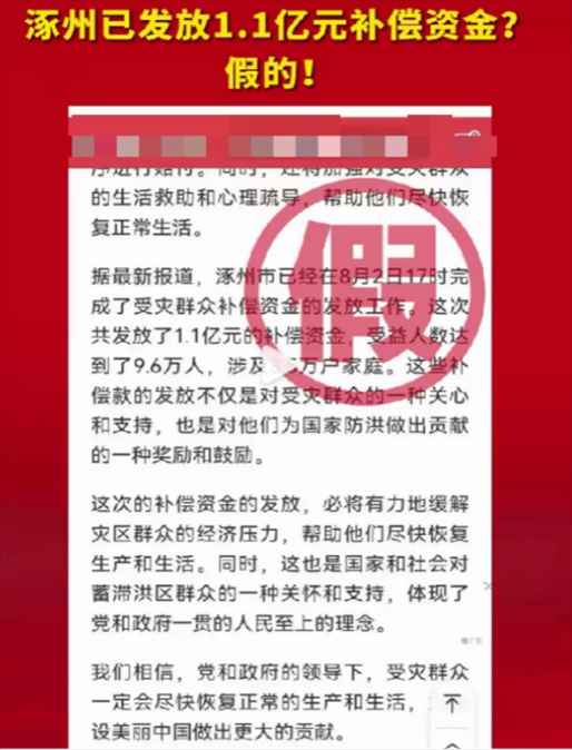 近日,網傳消息稱“河北省涿州市已經在8月2日完成了1.1億受災群眾補償資金的發(fā)放工作,受益人數達到了9.6萬人,涉及3.5萬戶家庭”。