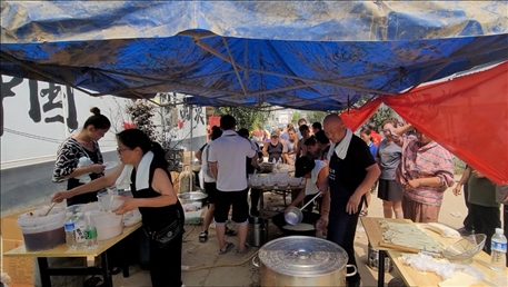 午飯時(shí)分,在西茨村村口一側(cè)的臨時(shí)飯點(diǎn),志愿者從臨時(shí)搭建的鐵鍋中,盛出一碗碗熱湯燴面,捧給排隊(duì)村民。這是涿州市城區(qū)一家燴面館免費(fèi)給村民提供的。