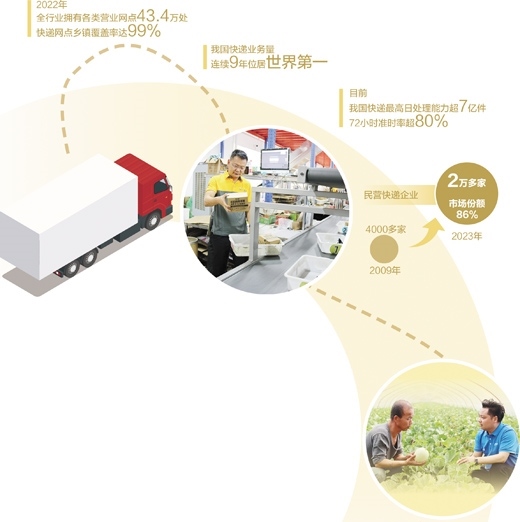 上圖:徐峰在查看快遞分撥情況。本報(bào)記者 王永戰(zhàn)攝 下圖:趙大榮(右)在為村民講解甜瓜包裝技術(shù)。受訪(fǎng)者供圖數(shù)據(jù)來(lái)源:國(guó)家郵政局