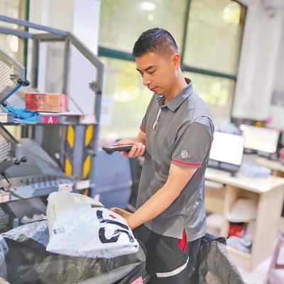 午后,湖北順豐速運(yùn)有限公司武漢唐家墩網(wǎng)點(diǎn),張?jiān):屯聜兪炀毜貙⒋笮〔灰坏目爝f件分類(lèi),裝入不同的袋子中。每裝滿(mǎn)一個(gè)編織袋,張?jiān)>驮诖谙路劫N上二維碼,再用機(jī)器掃描登記,確認(rèn)無(wú)誤后裝車(chē)發(fā)運(yùn)。