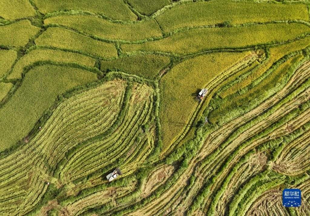 近日,四川東部廣安市近200萬畝水稻進入成熟收獲期,農民在田間忙碌,收獲水稻。