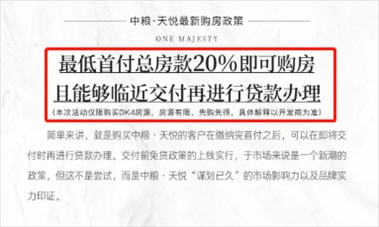 8月26日,紅星資本局向“中糧天悅”售樓部求證此時,一名置業(yè)顧問回復(fù)稱,最近確實推出了“先交付后還貸”的購房政策,購房者可以先交首付,簽訂購房合同,交房前再辦理貸款即可。