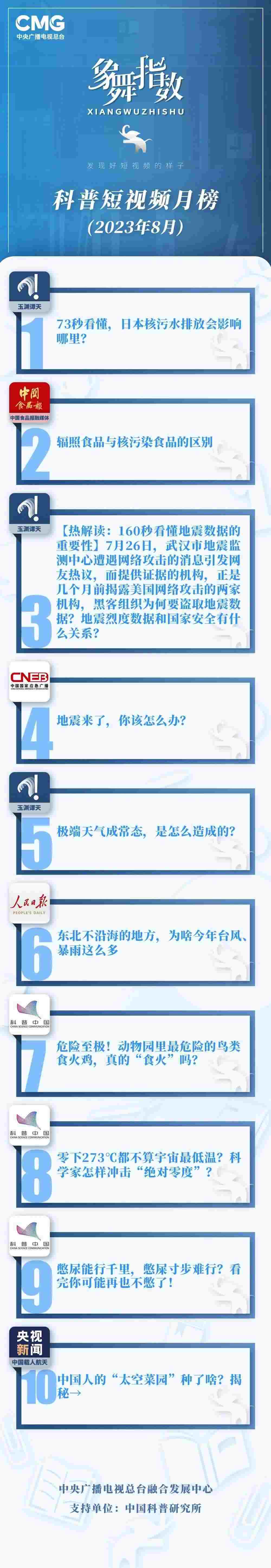 中央廣播電視總臺(tái)“象舞指數(shù)”評(píng)議品牌,推出科普短視頻月榜、總臺(tái)科普短視頻月榜。在2023年8月,值得注目的內(nèi)容有: