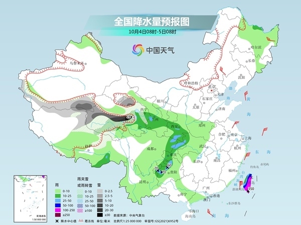 明天,新疆北疆北部和南疆盆地高海拔地區(qū)、西藏北部,青海東部和中南部、甘肅西部等地有中到大雪或雨夾雪,其中青海東南部部分地區(qū)有暴雪,局地大暴雪(20~28毫米);甘肅南部、陜西中南部、四川東北部、重慶中西部、貴州西北部、湖北西部以及臺灣島等地有中到大雨,其中貴州西北部、臺灣島中東部部分地區(qū)有暴雨或大暴雨,臺灣島東南部局地特大暴雨(250~350毫米)。