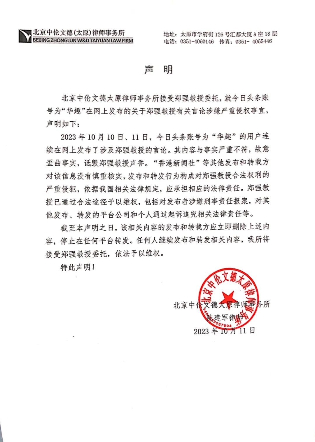 同時(shí),北京中倫文德太原律師事務(wù)所接受鄭強(qiáng)教授委托發(fā)表聲明,稱(chēng)將依法予以維權(quán)。