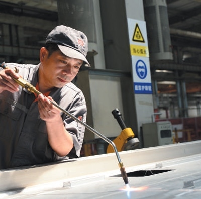 周晶輝正在對鋁合金車體進行焊接。金萬寶攝